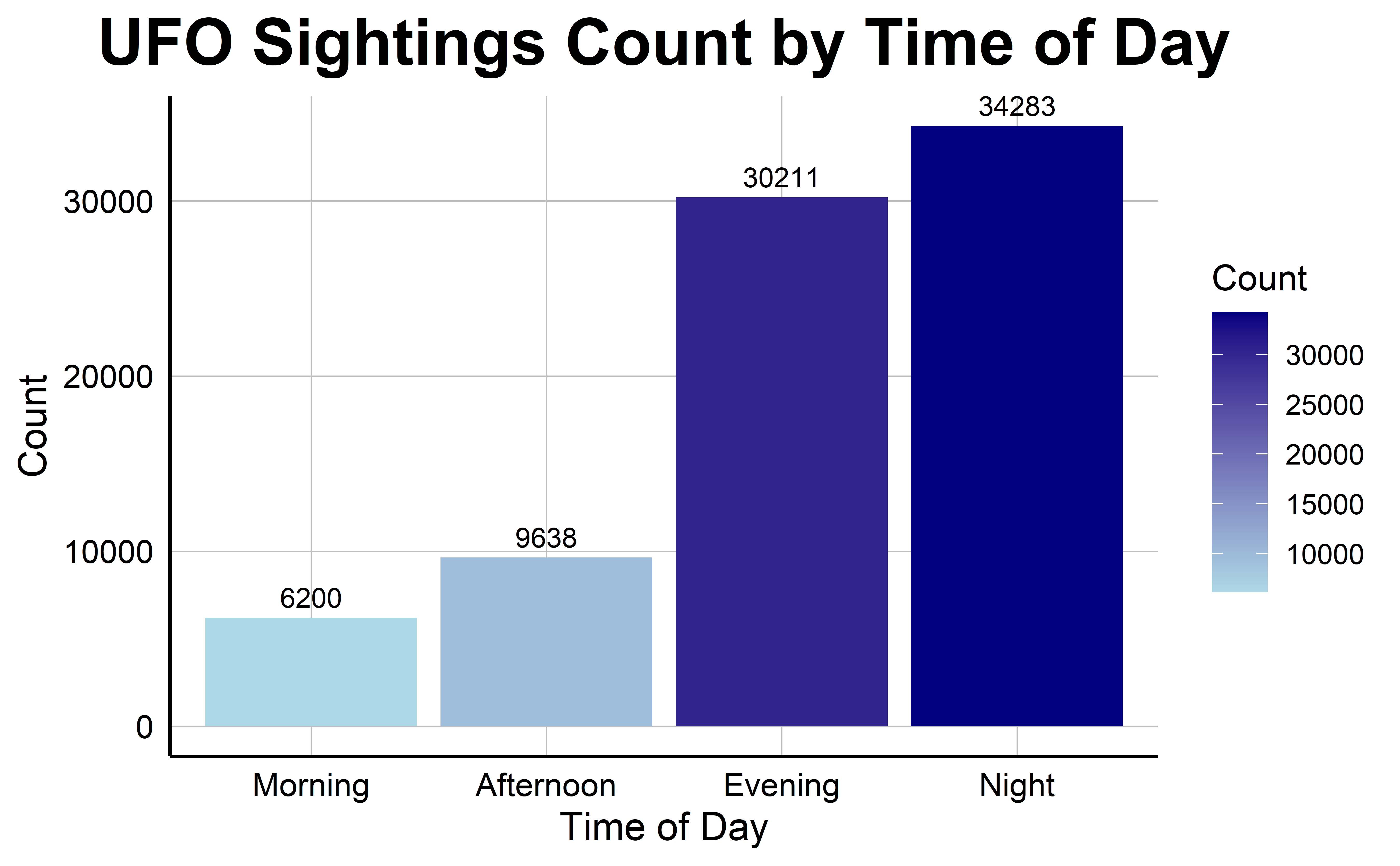 Nighttime records the highest UFO sightings, with 34,283 occurrences, followed closely by Evening with 30,211 sightings.