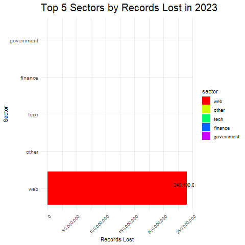 Data Collection: Obtain “World’s Biggest Data Breaches & Hacks” dataset from informationisbeautiful.net (2003-2023) with variables: organization, records lost, year, date, sector, method, and data sensitivity.